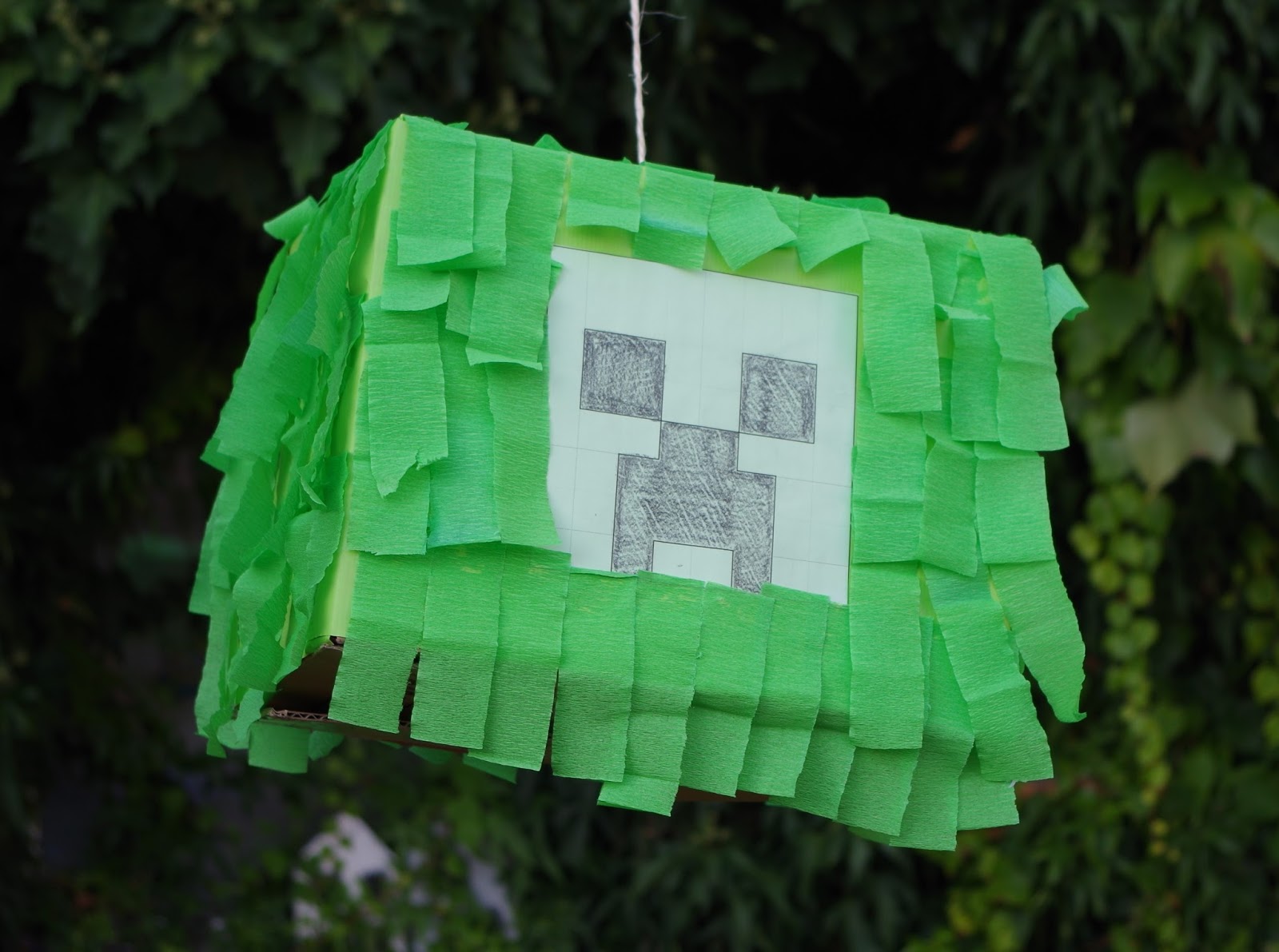 Eine quadratische Taschentücherbox in grünes Geschenkpapier gewickelt, ebenfalls ein Creepergesicht daraufgemalt, und dann konnten sie sich Mottogerecht die Nase putzen.